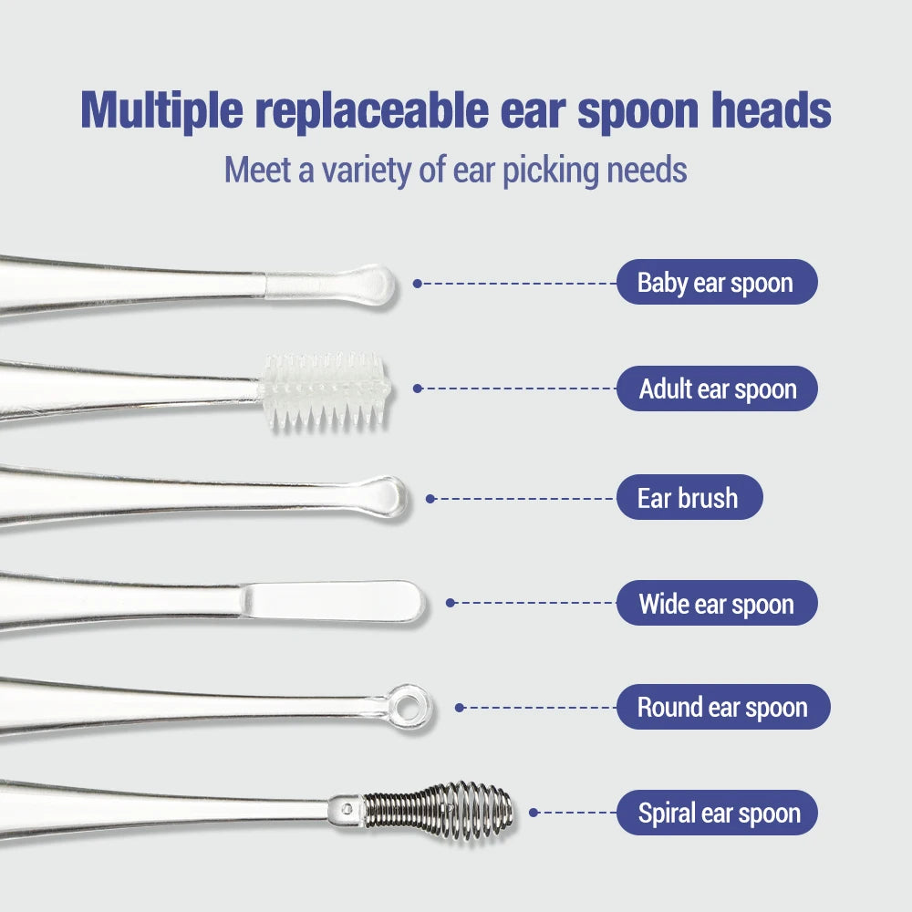 This illuminated ear cleaner is designed for safe and effective earwax removal, enabling painless cleaning and foreign object extraction while maintaining ear hygiene. Its integrated LED light and magnifying glass provide a clear view inside the ear canal, ensuring precise use without injury. Featuring six interchangeable tips, this tool suits both adults and infants, accommodating a range of needs. Powered by a 60mAh lithium battery, it charges quickly in 30 minutes for up to 40 days of use with just 10 minutes weekly. Compact and lightweight, it includes a convenient storage case for easy portability.